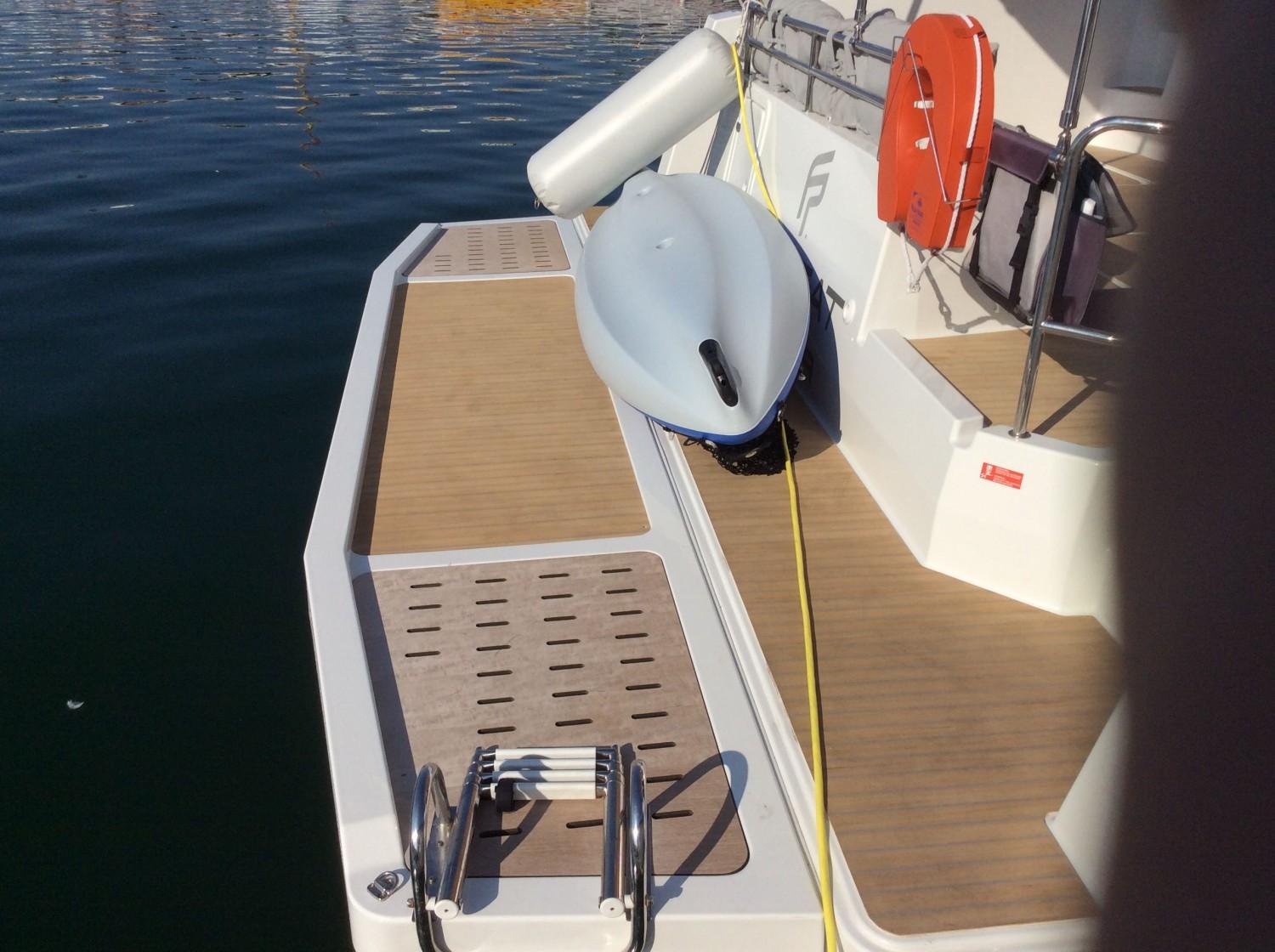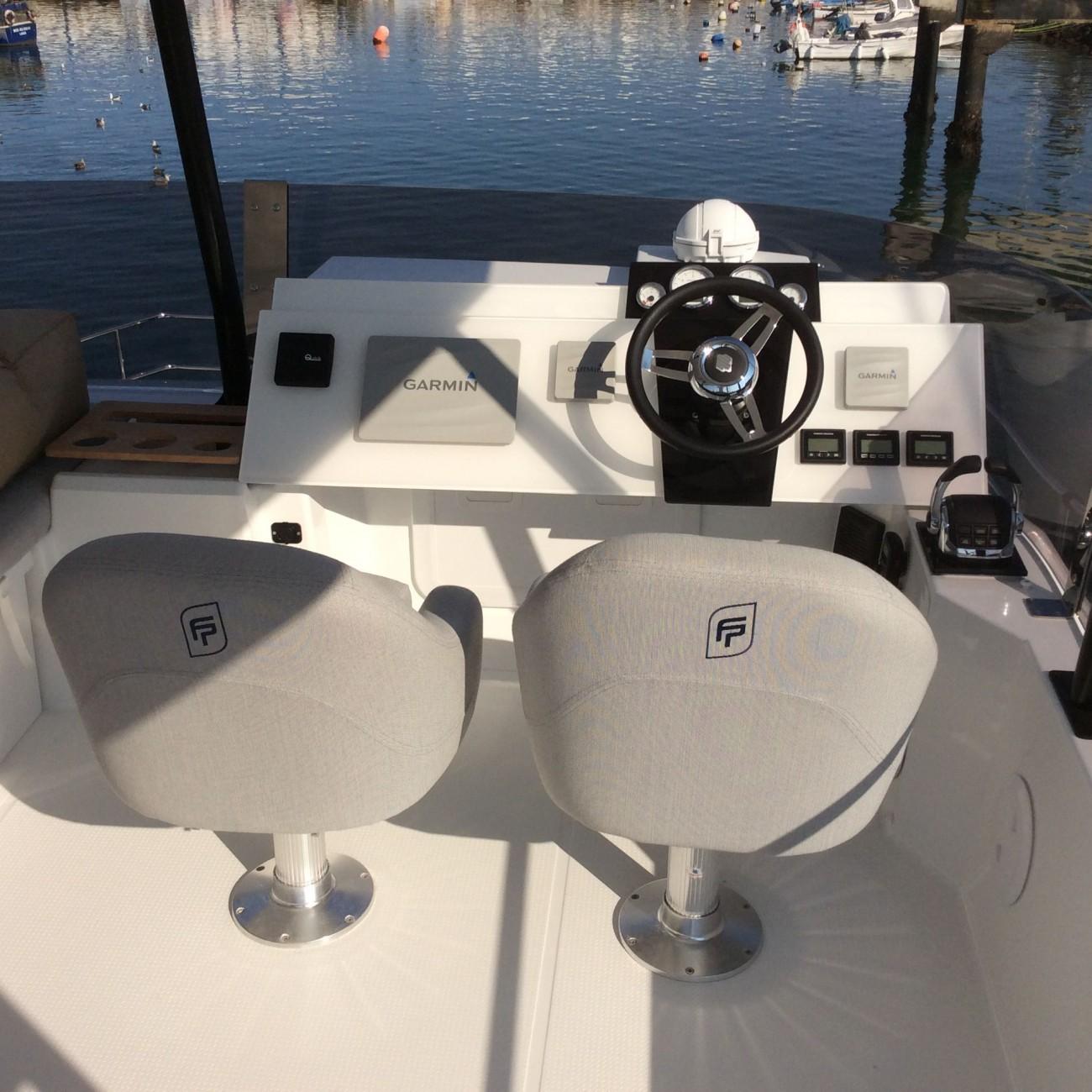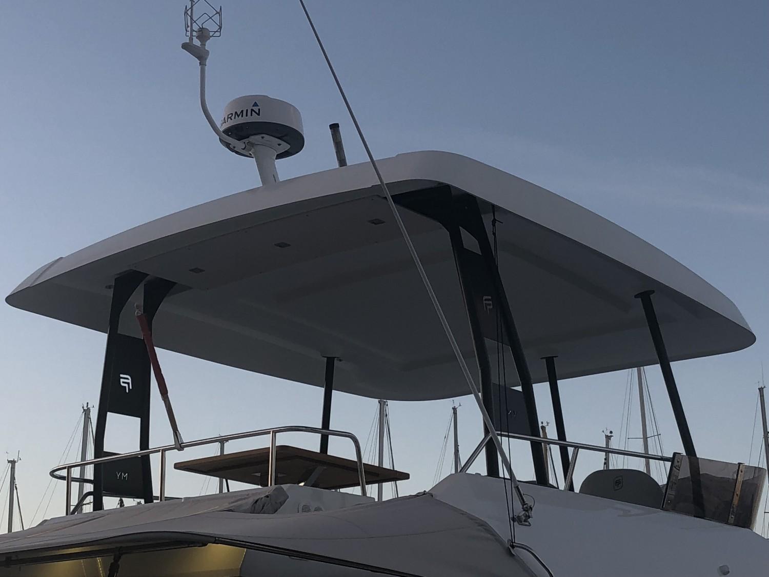 ÉQUIPEMENT : coussins de pont avant extérieur, coussins d'extérieur dans le fly bridge, table flying bridge , assise supplémentaire de poste de barre de fly, bain de soleil de Fly bridge, housse pour les assises de poste de barre de flybridge, housse pour la console d'instruments de flybridge, bimini hard top, bimini de cockpit, stores extérieurs de carré, plateforme arrière fixe, Teck synthétique jupes et cockpit, décoration extérieure de coque, sellerie intérieure tissu beige, sommiers à lattes pour 3 cabines, moquette dans la cabine propriétaire et carré, table repas de carré