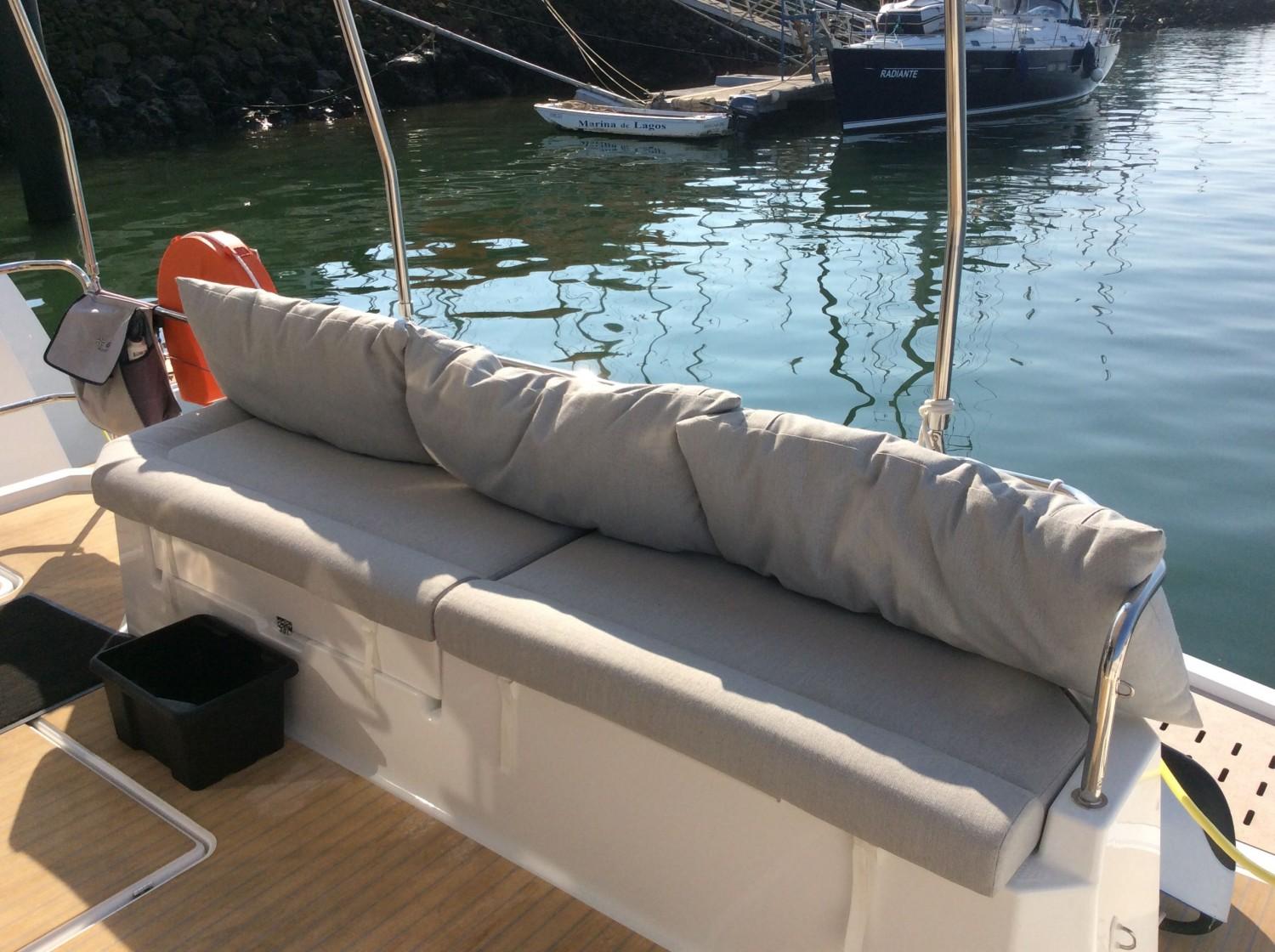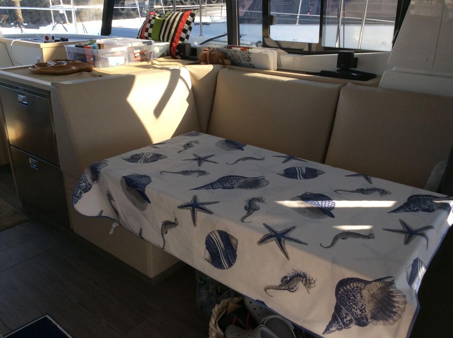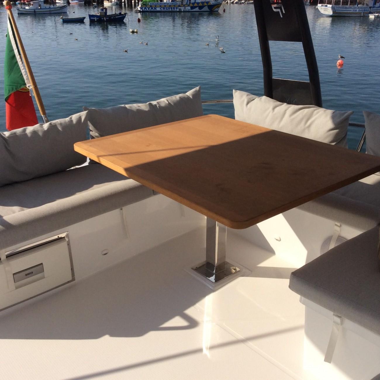 ÉQUIPEMENT : coussins de pont avant extérieur, coussins d'extérieur dans le fly bridge, table flying bridge , assise supplémentaire de poste de barre de fly, bain de soleil de Fly bridge, housse pour les assises de poste de barre de flybridge, housse pour la console d'instruments de flybridge, bimini hard top, bimini de cockpit, stores extérieurs de carré, plateforme arrière fixe, Teck synthétique jupes et cockpit, décoration extérieure de coque, sellerie intérieure tissu beige, sommiers à lattes pour 3 cabines, moquette dans la cabine propriétaire et carré, table repas de carré